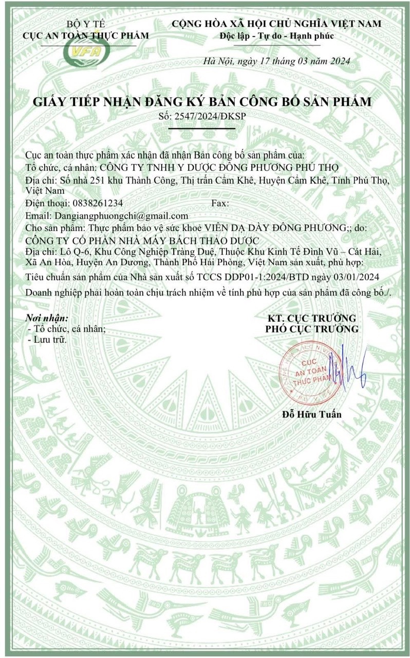 Tinh hoa y học cổ truyền dân tộc kết hợp cùng công nghệ sản xuất hiện đại cho ra đời VIÊN DẠ DÀY ĐÔNG PHƯƠNG. Sản phẩm đồng hành của người Việt trong việc chăm sóc dạ dày, từng ngày nâng cao chất lượng sức khỏe và cuộc sống.